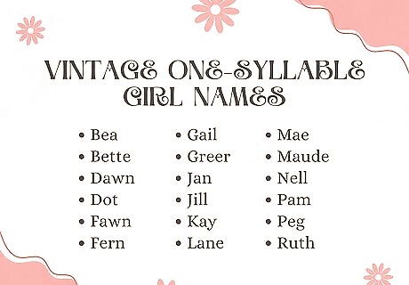 One-syllable names are always chic, but as licensed clinical psychologist Kate Berasi, PhD, says, "You also may want the name to have a connection to family or your heritage." Looking for something a bit more vintage? We’ve got you! There are tons of single-syllable names that have classic, vintage vibes. Here are a few of our favorite options to inspire you: Bea: “Bringer of happiness” or “blessed,” American and French origins. Bess: “God is my oath,” Hebrew origin. Bette: “God’s promise,” Hebrew, British, and Dutch origins. Blanche: “Fair,” French origin. Blythe: “Happy” or “cheerful,” British origin. Dawn: “Daybreak,” British origin. Dot: Short for “Dorothy,” which means “gift of God,” British origin. Fawn: “Young deer,” French origin. Faye: “Loyalty,” “belief,” “fairy,” or “beech tree,” French, Latin, and British origins. Fern: “Fern,” British origin. Fleur: “Flower,” French origin. Flo: Short for “Florence” or “Flora,” meaning “flourishing” or “flower,” Latin origin. Gail: “Joy” or “exultation,” Hebrew origin. Gayle: “Joy of the father,” British, German, and Hebrew origins. Greer: “Alert,” “watchful,” “quick,” or “swift,” Scottish origin. Jan: “God is gracious,” Swiss, Danish, Hebrew, and Slavic origins. Jane: “God is gracious,” Hebrew origin. Jill: “Youthful,” “downy-haired,” or “child of the gods,” Latin origin. Joan: “God is gracious,” Hebrew origin. Joyce: “Lord” or “joyous,” Latin origin. Kay: “Pure,” Greek origin. Lane: “Path,” “spear,” or “warrior,” British, Irish, and Gaelic origins. Mae: “May,” British origin. Maude: “High tower” or “mighty in battle,” French, German, and Hebrew origins. Nell: “Shining light” or “horned,” Latin, Greek, French, and British origins. Pam: “All honey” or “all sweetness,” British and Greek origins. Peg: “Pearl,” Greek origin. Ruth: “Friend,” Hebrew origin. Sue: “Lily,” Hebrew origin. Viv: “Lively” or “alive,” Latin origin.