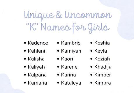 Pick one of these names if you’re looking for something more rare. These lesser-known “K” names are perfect if you want your little girl to stand out in the crowd (and decrease the chances that she’ll have the same name as any of her classmates!). Here are some options to inspire you: Kadence: “Rhythm” or “flow,” French origin. Kahlani: “Sea and sky,” Hawaiian origin. Kalisha: “Great joy,” American origin. Kaliyah: “Beloved,” “sweetheart,” “darling,” or “noble,” Arabic and Hebrew origins. Kalpana: “Imagination,” Indian origin. Kamaria: “Moon,” Swahili origin. Kambrie: “Free person,” Welsh origin. Kamiyah: “Acolyte,” “illusion,” or “magic,” American origin. Kaori: “Aroma,” Japanese origin. Karene: “Love,” Scandinavian origin. Karina: “Pure” or “chaste,” Scandinavian and Greek origins. Kataleya: “Orchid,” Spanish origin. Keshia: “Great joy,” African origin. Keyla: “Who is like God?” Hebrew origin. Keziah: “Cassia tree” or “cinnamon,” Hebrew origin. Khadija: “Respect,” Arabic origin. Kimber: “Old kin,” English origin. Kimbra: “Cyneburga's clearing,” British origin. Kimiko: “Noble,” Japanese origin. Kinneret: “Harp,” Hebrew origin. Kiyomi: “Ocean,” Japanese origin. Konstanze: “Constant,” German origin. Koretta: “Maiden,” Greek origin. Ksana: “Praise be to God,” Russian origin. Ksenia: “Wanderer,” Russian origin.