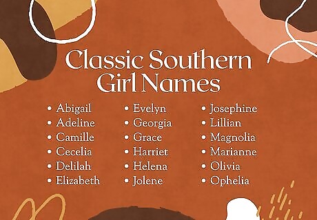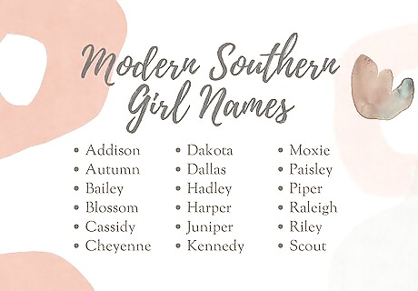 Go for one of these names if you’re looking for a contemporary vibe. These trendy Southern names are currently rising in popularity, which makes them ideal if you want a name with a modern sound. Here are some of our favorite picks to inspire you: Addison: “Son of Adam,” British origin. Alabama: “Plant gatherers,” Native American origin. Autumn: “Fall” or “season of “harvest,” Latin origin. Bailey: “Berry clearing,” British and French origins. Blossom: “Bloom” or “flower,” English origin. Cassidy: “Curly-haired,” Irish origin. Cricket: “Insect,” American origin. Cheyenne: “Little Cree,” Native American origin. Dakota: “Friend” or “ally,” Native American origin. Dallas: “From the dales,” Scottish origin. Hadley: “Heather meadow,” British origin. Harper: “Harp player,” English origin. Juniper: “Evergreen,” Latin origin. Kennedy: “Helmet-headed,” Scottish origin. Moxie: “Energetic” or “driven,” American origin. Paisley: “Church,” Scottish origin. Piper: “Pipe player,” British origin. Raleigh: “Roe deer clearing,” English origin. Riley: “Rye clearing,” British origin. Scout: “To listen” or “sent to discover,” French origin. Skyler: “Scholar” or “sky,” British and Dutch origins. Willow: “Willow tree,” English origin. Wynona: “Firstborn daughter,” Native American origin.