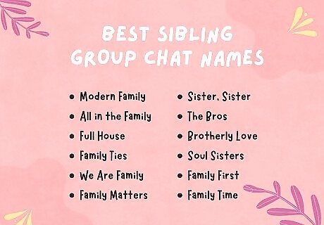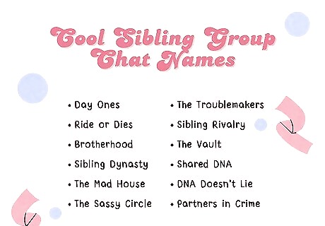 Pick a fun group chat name for you and your siblings. You may already have a family group chat with your parents, but your parents don’t need to know everything. Having a gc with just your siblings is a great way to bond with them. Here are some fun group chat names to choose from: Keeping Up with the [Last Name] House of [Last Name] Modern Family All in the Family Full House Family Ties Team [Last Name] The Family Tree We Are Family The [Last Name] Bunch The Proud Family Family Matters Sister, Sister Brothers & Sisters The Bros Brotherly Love Soul Sisters Family First The Family Knots Family Time Sibling Shenanigans Band of Brothers The Family Treehouse Next of Kin Emergency Contacts