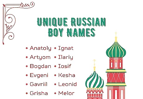 Pick a unique name you don’t hear often. Some Russian names, like Dimitri and Nikolai, are popular outside of Russia. If you want something a bit more unique, however, try to dig a little deeper. Here are some names you may not be as familiar with if you aren’t from Russia: Anatoly (meaning: “from the east, rising sun”) Arseni (meaning: “virile, strong”) Artyom (meaning: “safe, healthy, strong”) Bogdan (meaning: “gift from God”) Evgeni (meaning: “well-born, noble”) Gavriil (meaning: “man of God”) Gleb (meaning: “God, inheritance, legacy”) Grisha (meaning: “watchful, vigilant”) Ignat (meaning: “fiery”) Ilariy (meaning: “cheerful”) Iosif (meaning: “God increases”) Kesha (meaning: “innocent”) Leonid (meaning: “lion”) Melor (meaning: “iron man”) Miroslav (meaning: “peace, glory”) Nikandr (meaning: “victory of man”) Nikita (meaning: “unconquered”) Orel (meaning: “light of God”) Pavel (meaning: “small”) Rodion (meaning: “song of the hero”) Todor (meaning: “gift of God”) Vadim (meaning: “attractive”) Yasha (meaning: “supplanter”) Yevgeniy (meaning: “well-born”) Zhivago (meaning: “life”) Not sure if you’re having a boy or a girl? Check out our “Russian Girl Names” article for some feminine options!