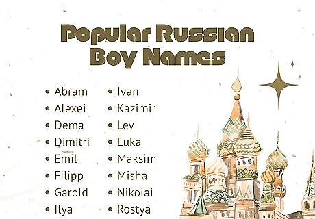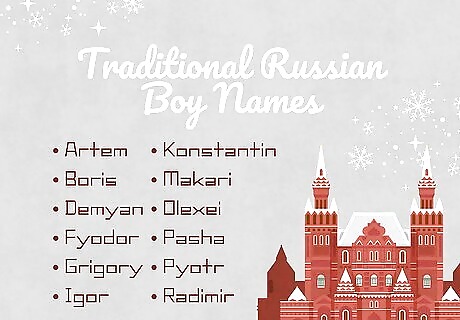 Choose a name with a long history. Many traditional Russian names are still popular today. If you want to pay tribute to your heritage, consider choosing a name inspired by a relative. Or, choose the name of your favorite Russian author or historical figure. Here are some examples: Artem (meaning: “dedicated to Artemis, work of art”) Boris (meaning: “warrior, short, wolf”) Demyan (meaning: “to tame, subdue”) Fyodor (meaning: “God’s gift”) Grigory (meaning: “watchful, alert, curious, swift”) Igor (meaning: “warrior”) Konstantin (meaning: “steadfast”) Makari (meaning: “blessed, happy; I wish”) Olexei (meaning: “defender of humankind”) Pasha (meaning: “small, humble”) Pushkin (meaning: “gun, cannon”) Pyotr (meaning: “rock, stone”) Radimir (meaning: “happy, famous joy”) Rostislav (meaning: “growth, glory, fame”) Rurik (meaning: “famous ruler”) Samuil (meaning: “told by God”) Timofey (meaning: “honoring God”) Valentin (meaning: “strength, health”) Vanya (meaning: “God is gracious”) Vasili (meaning: “royal, kingly”) Vitaliy (meaning: “life”) Vladimir (meaning: “great ruler, peaceful ruler”) Yakov (meaning: “supplanter”) Yuri (meaning: “farmer”) Yuroslav (meaning: “fierce glory, bright fame”) Looking for a traditional Russian last name, too? Check out our “Russian Last Names” article for inspiration!