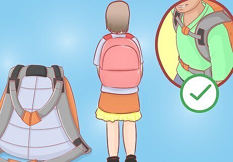 Look for padding and secure straps. A backpack that has padded straps and a padded back (that is, the side that makes contact with the kid's back) will be more comfortable and may help prevent pinched nerves in the neck area. Choose models with waist straps as well, as these help to ensure better weight distribution and pack stability. Check that the straps are made of strong material, are well attached to the bag, and have sturdy but easy-to-operate buckles. Leather straps, for instance, might be more fashionable, but often simply add more weight without adding strength. Check a backpack in use for frayed straps, ripped canvas, or broken buckles.