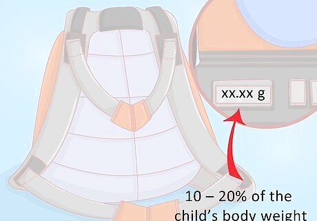 Weigh the full backpack. How do you know if your child's backpack is too heavy? Experts tend to recommend that children not carry packs that weigh more than 10 – 20% of the child's body weight, with 15% as a common standard maximum. Weigh your child (without the backpack), then multiply the result by 0.15. Then, weigh the loaded backpack alone. If it weighs more than your multiplied result, it's too heavy. For instance, say you have an 80-pound child with a 17-pound backpack. 80 x .15 = 12. Since the bag weighs more than this amount, it is too heavy (by at least five pounds). If your child has to lean forward to hold the pack on his back, or complains of neck, shoulder, or back pain, the backpack is likely too heavy — regardless of what the scale says.