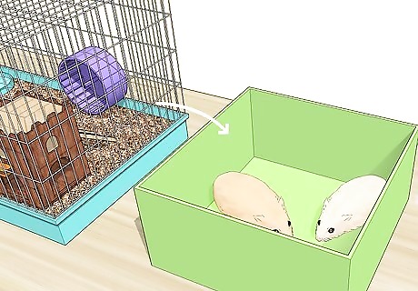 Relocate your hamster. Before you clean your hamster’s cage, you’ll have to trap it and then remove it from the cage. Do this by picking your hamster up and placing it in a temporary cage (with a top that closes). Its best to ask your parents or a sibling to help, as you might need a spare pair of hands. This is important, as your hamster could easily get out of your hands and run off.