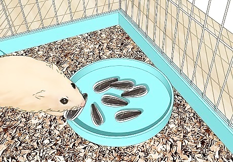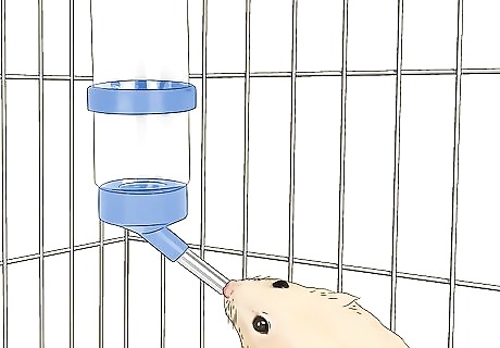 Provide your hamster with water. Put out multiple sources of water. One good source is a shallow dish of water. Another good source is a drip bottle you can hang on the side of the cage. This way, your hamster will always have plenty of fresh and clean water. Change your hamster’s water every day. In addition, make sure to clean their water bottle/bowl with warm water and soap every week.