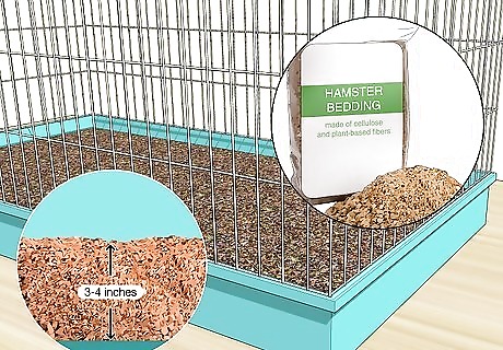 Provide your hamster with bedding. Line the bottom of the cage with 3 to 4 inches (7 to 10 cm) of bedding made of cellulose and plant-based fibers. This is important, as it will give your hamster a cozy and soft place to play, sleep, and walk through. However, avoid products that have dyes or chemicals, as they could irritate your hamster’s respiratory system. Stay away from: Wood shavings Cat litter Corn cobs Newspapers Anything with an unnatural scent or smell