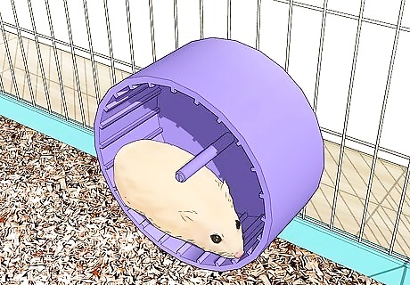 Give your hamster some toys. Just like children, hamsters need toys to play with. Without toys, they’ll be bored and generally unhappy. To avoid this, give your hamster several different types of toys and swap them out regularly so it doesn't get bored with them. Some good toys include: A hamster wheel that is solid plastic (don't use one with metal bars) Chew toys, like unpainted and untreated pieces of wood. Walnut shells Hard dog biscuits