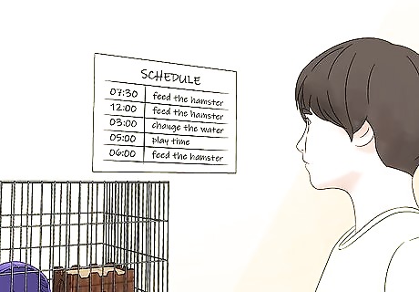 Put together a schedule and chart. Create a chart of your hamster-related duties. You can either download or create your own chart. This way, you’ll have a constant reminder of everything you need to do and when you need to do it. Once you have your chart and you’ve filled it out, post it in a place you’ll see it all the time. Consider putting aside fifteen minutes before school to feed your hamster, fifteen minutes after school to feed and check on your hamster’s water, and an hour on the weekends to clean the cage.