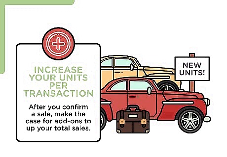 Increase your units per transaction. After you confirm a sale, make the case for add-ons to up your total sales. If you've just sold a printer, mention some deals you're running on ink cartridges or reams of paper. Frame it as a money and stress-saving measure for them: "You'll need these eventually and this way you won't have to worry about it."