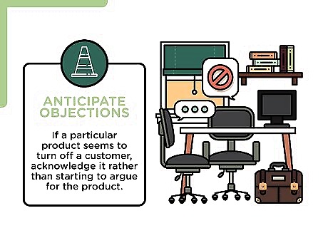 Anticipate objections. Pay close attention to your customers reactions. Facial expressions and body language can be a big "tell" in the customer's attitude. As you pitch the product to them, remember that you are there to sell whatever is going to make the customer feel really good about their purchase. Guessing what part of the product or price the customer is objecting to will help you respond tactfully and persuasively. If a particular product seems to turn off a customer, acknowledge it rather than starting to argue for the product. You might objectively name some of its merits while justifying the customer's hesitation: "It is more expensive than the others, you're right. The hand-stitching takes a lot more time to complete, but it results in much more durable shoe."
