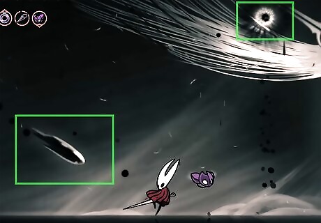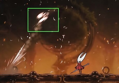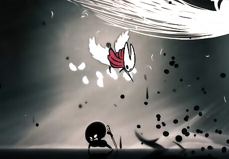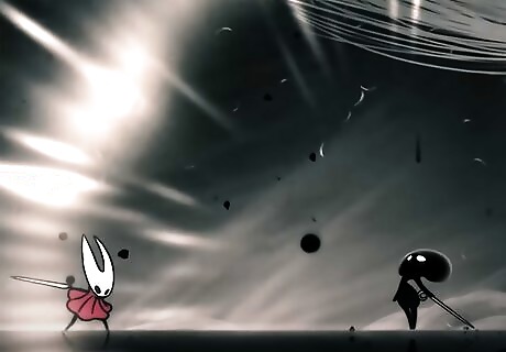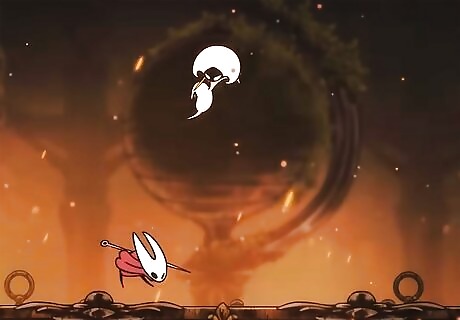 Dodge over Lace’s horizontal dash and slash and hit her once. Lace’s first move is a dash and slash. She makes a noise and sprints along the platform before swinging once. As she comes to you, jump and dash horizontally away from her. If you’re close enough to hit her, strike her once before repositioning. Basic strategy overview: The first Lace fight is an exercise in patience and positioning. Do not try to chase her. Her attacks are all harder to dodge the closer you are, so focus on letting her come to you. It’s okay if this fight takes a little longer than the average boss fight! Why only hit her once? Lace parries very quickly, and sort of at random. You won’t have time in this fight to get more than one hit in, except when you stun her twice. The stuns appear at the end of each third of the fight, so you can pace the fight out in terms of how long it will take based on how long it takes you to stun Lace.