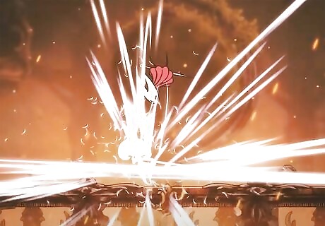 Use the circle of blades attack to heal or attack once. The circle of blades attack is identical to the first fight. Simply avoid the giant circle in the middle and wait it out on the edge of the platform. This is actually the perfect time to heal if you get low. However, this platform is also bigger than the first fight’s, so if you end up on the same side as her, you can hit her at the beginning of the animation. Can you still hit Lace after the end of this move? Yes! Dash in after she slams on the ground and get 1-2 hits in before repositioning.