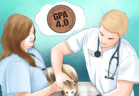 Work towards vet school in college. Once you've completed high school, you need to get an appropriate college degree that will help you get a spot in vet school once you graduate. You should choose a major that gives you a strong grounding in the biological and physical sciences. Ask your college adviser about the best major or combination of majors if your ultimate goal is to enroll in vet school. Keep your GPA high. Your GPA should be a 3.5 or higher if you want to get into a solid vet school after college. This is especially important later in college, while you're taking more advanced courses, as most vet schools pay close attention to your GPA during the last three to four semesters. You should be gaining clinical experience while an undergraduate. Volunteer at a veterinary clinic and seek internships that involve veterinary science during your summers. Take the Graduate Records Examination (GRE) sometime before you graduate. Most veterinary school require a high GRE score for admittance, so study hard. You may even want to enroll in a GRE prep course the summer before your senior year to assure a high score. Most vet schools ask for two to three Letters of Recommendation from professors or people who you worked with professionally during your time as an undergraduate. Some schools actually require 2 letters from a veterinarian, so staying in touch with those you worked with during your clinical training is also important. You should also strive to make good impressions on any professors you have classes with so you'll have someone to ask for a recommendation down the road.