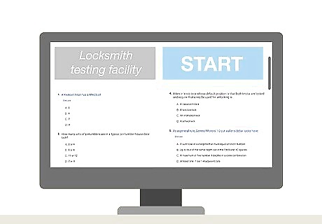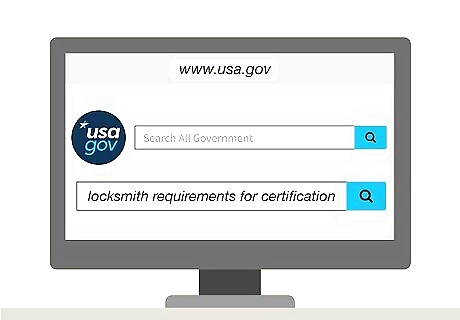 Look online to find the requirements for certification where you live. The certification requirements for locksmiths differ depending on the state and country that you’re in. Go online and look for the requirements where you live. Search on your state government’s official website to ensure that you’re looking at the legal requirements and not a private business’s advice on how to get certified. The certification process can take 1-6 weeks depending on where you live. In some states, the Department of Consumer Affairs is in charge of locksmithing licensure. In other states, the business bureau regulates locksmith certification. In many states, vocational schools are allowed to certify students that graduate. The shorter 5-20 week classes are rarely allowed to give certifications, though. Some states and countries have no certification requirements for locksmiths. In these states, anyone can work for a locksmith.