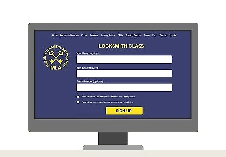 Sign up for a locksmith class for a faster way to learn the craft. Locksmithing classes are typically hosted by private companies or locksmithing businesses. Look online to find a class near you if you want to learn the craft and become qualified without spending a ton of time and money on a vocational degree. These classes are typically very intensive, and will focus specifically on doors and home locks. These classes typically take 5-20 weeks to complete and may have a test at the end.Tip: Unless you want a precursory introduction to the craft, don’t bother taking a class that won’t qualify you for a certification where you live. Look up the requirements for your specific state or country to find out if a formal training course can help you get certified. If you complete a certified lockpicking course, you will be awarded a letter of recommendation demonstrating that you’ve completed their coursework. This will help you get certified in most states. Locksmithing requires hands-on experience, and there are a lot of disreputable online programs. Sign up for an in-person class if you can.