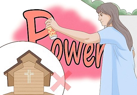 Have respect for where you do the graffiti. There are places that you do not graffiti because it lacks respect. These are: Places of worship such as churches, synagogues, mosques and graveyards. This includes shrines, temples and natural areas of worship. Wherever people practice and display their worship and beliefs, do not do graffiti art. Places of learning and education, such as schools, universities and mobile schooling vans. Education is important for raising the standards of humanity and since part of the art of graffiti is to inform, don't override other people's reasonable attempts to inform. Moreover, you will likely be caught and shamed for this. Places of residence such as lived-in houses, holiday houses, apartments, etc. Also, do not place graffiti on personal property such as cars, mailboxes, garage doors and the like. It is yet another form of disrespect to graffiti any of these items and gives graffiti a bad name.