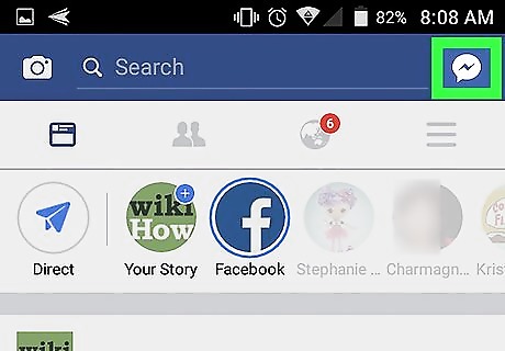 Tap the Messenger icon. It's the chat bubble with a lightning bolt inside at the top of the screen. This opens the Facebook Messenger app. If you don't have the app installed, you'll be prompted to install it now. Follow the on-screen instructions to download it from the Play Store.