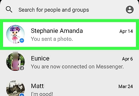 Select a conversation with the person you want to block. If you chatted with them recently, you should be able to scroll down and see them near the top of the list. If not, type their name into the Search box at the top of the screen, then tap their name in the search results.