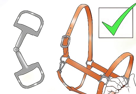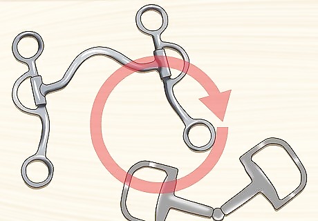 Switch your bits. Some horses don’t like particular types of bits. They may dislike the taste or be uncomfortable with the size. If your horse is reluctant to take the bit, you might want to consider switching to different material or thickness. Test out different bits to see which one is best for your horse. Some horses prefer the taste of copper bits over that of stainless steel or nickel. Some horses may do well with plastic bit. Some horses may be entertained by a bit with spinning parts. Bits that are too small may be pinching the horse's mouth while bits that are too big may hang out of their mouth. Rubber bits with large diameters may work well with younger, more inexperienced horses. A loose ring, 3-piece snaffle is another good type of bit to start out with.