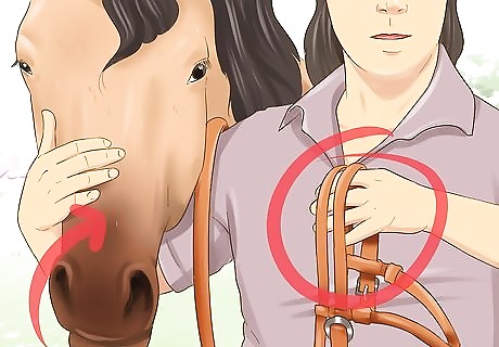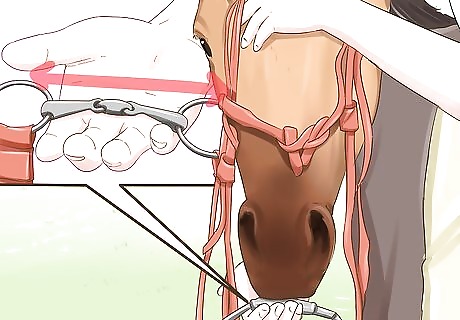 Pull the bridle up. Hand the top of the bridle to your right hand, and take the bit in your left hand, resting it against your flat fingers. Use your right hand only to hold the bridle's weight. Gently press the bit against their lips.
