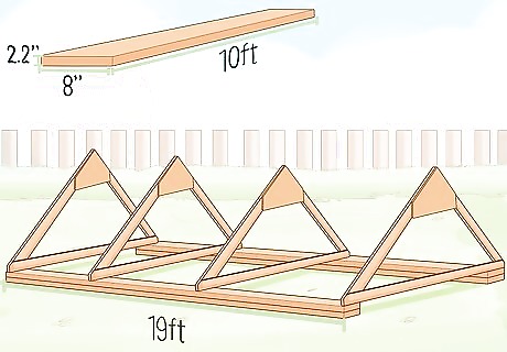 Trim the boards for the roof. Cut 2 2 by 8 in (5.1 by 20.3 cm) boards to 10 feet (3.0 m), one each to go on the top of the walls at the front and back. Cut 11 2 by 8 in (5.1 by 20.3 cm) rafters for the roof. The rafters will run from the top of the front wall to the top of the back wall. Measure how long you want yours to be when you get the roof up. They will need to be at least 19 feet (5.8 m) to make an overhang of 1 foot (0.30 m) on each end.