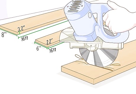 Trim the foundation boards to size. Cut 3 2 by 8 in (5.1 by 20.3 cm) boards to 16 feet (4.9 m). These boards will form part of the mudslips or bottom of the shed. Also, trim 2 2 by 6 in (5.1 by 15.2 cm) boards to 16 feet (4.9 m), which will form the other part of the mudslips. Finally, cut 15 2 by 6 in (5.1 by 15.2 cm) boards to fit across the center of the floor, going from one mudslip to the other. They should be 10 feet (3.0 m) each. Set these in one area so you know they're for the foundation.