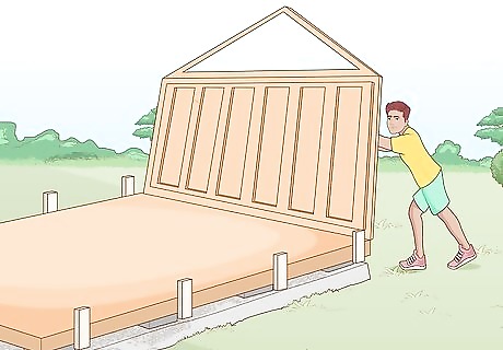 Ask for help to raise the back wall and nail it in place. While there are ways to do this on your own, the easiest and safest way is to grab another person to help. Brace the bottom against the pieces you nailed into the floor and swing the top edge up, walking it into place with your hands.