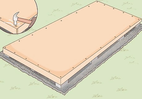 Trim plywood to fit over the flooring and nail it in. If your shed came in a kit, the boards should already be cut to fit. Otherwise, you'll need to measure the boards against the floor you've created. Lay them out to see how the pieces fit and trim off any areas that are too big for the floor you've created. Once your pieces all fit, nail the particle board into the joists below using a nail gun. It helps to draw chalk lines across the board where the joists are so you know where to nail.