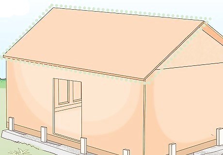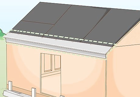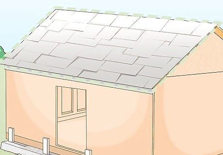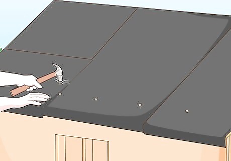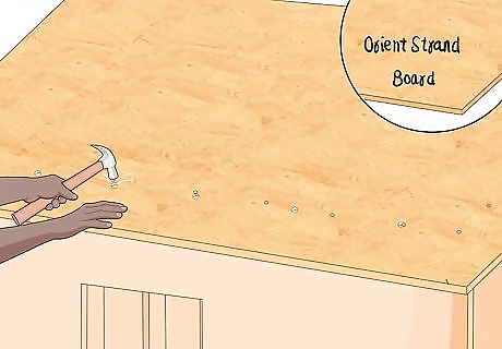 Cut and nail plywood or orient strand boards (OSB) to the roof. These will form the hard part of the roof. Measure how long and wide the boards should be. They need to cover the rafters with no overhang. Once you have them cut, lay them on the roof and nail them into place.