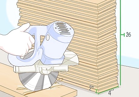 Cut 2 by 4 in (5.1 by 10.2 cm) pieces to length for the walls. Cut 26 boards to the height you want at the back of the shed, typically 6 feet (1.8 m); this equals 6 boards for the back wall and 10 for each of the sides. For the front, cut 4 boards that are 12 feet (3.7 m) high. Also, cut the boards for the tops and bottoms of the wall frames. Start with 4 boards that are 113 inches (290 cm) long for the front and back walls. For the sides, cut 4 boards that are 192 inches (490 cm) long. Always measure carefully before cutting the boards.