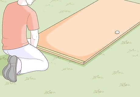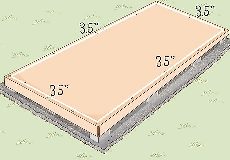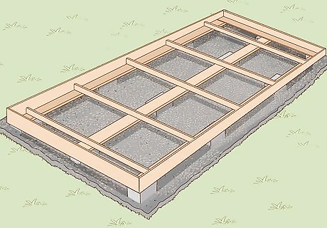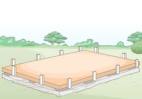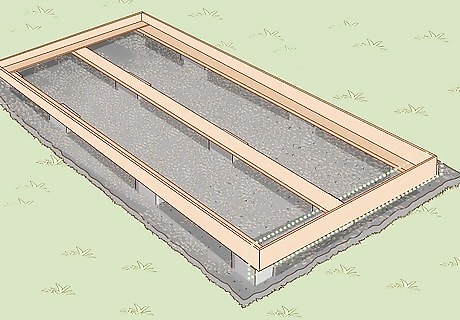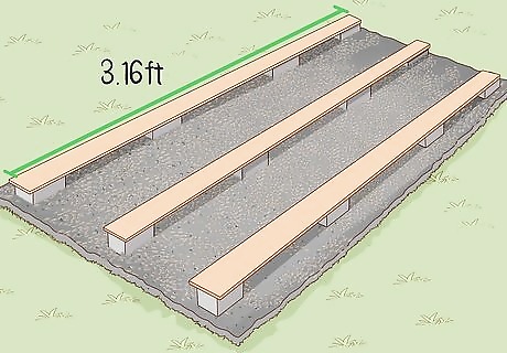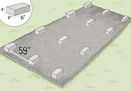 Set 12 solid concrete blocks in 4 inches (10 cm) of gravel. Choose blocks that are 4 by 8 by 16 inches (10 by 20 by 41 cm). Set them 59 inches (150 cm) apart from each other in the gravel you've laid out. When setting up the blocks, place them in a 3-by-4 square. Make 3 rows of 4 blocks, evenly spaced apart. After setting out the blocks, make sure the blocks are all level in the ground and check to ensure they are level to each other. If they're not, add 2 in (5.1 cm) patio blocks, cedar shingles, or asphalt roofing to the tops of any blocks that are short.