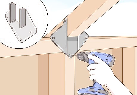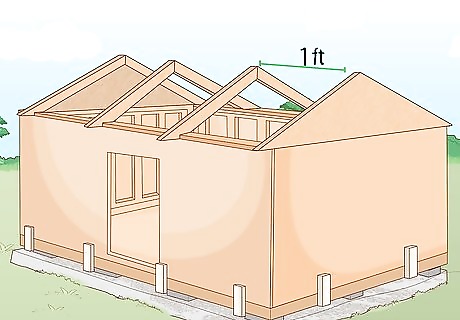 Space the rafters about 1 foot (0.30 m) apart across the roof. Put 1 on each end of the roof. Place the other boards evenly spaced out between the 2 end pieces. Place a hurricane tie on the inside where each rafter slides into the end boards. Screw them into place. A hurricane tie is a type of brace. Slide it over the bottom of the board. You should see holes to screw it into place.