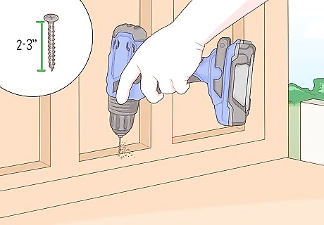 Screw the wall into place at the bottom. With a drill, screw through the bottom board in the frame of the wall into the floor below. Use at least 2 3 in (7.6 cm) screws between each vertical stud (board) to hold it in place. Make sure you leave even spaces on both edges of the back wall to slide the sides in.