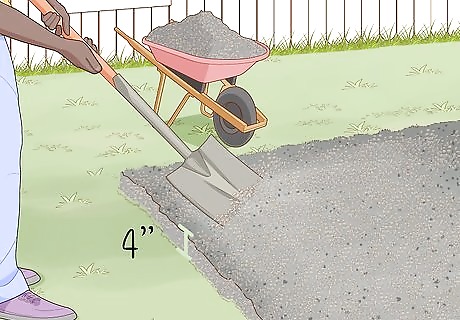 Lay down a foundation of gravel. Use a wheelbarrow and a shovel to spread it out. You'll need a square of gravel that's about 12 by 18 feet (3.7 by 5.5 m) and enough gravel to spread it to a depth of 4 inches (10 cm). You don't have to add gravel, but it will help keep the shed dry.