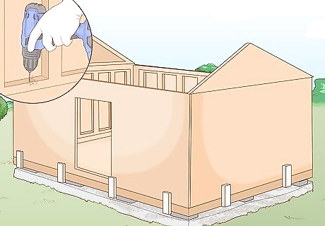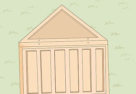 Raise the other walls and screw them in place. Go through the same process with the other walls, starting with the sides. After screwing in the bottoms, screw the sides into the back panel, too, placing a screw every 1 foot (0.30 m) or so. Face the right angle of the triangle on top to the front. That way, it will meet the front wall. Once you're done with the sides, do the same with the front, screwing it into place.