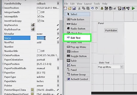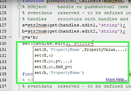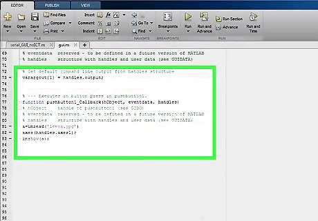 Locate the line of code in the code editor that says function varargout = pushbutton1_Callback(h, eventdata, handles, varargin). This is the callback function. Any code below this will be executed whenever the user pushes the button. Here we will make this change the text in the text box when the user clicks on the button