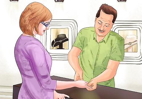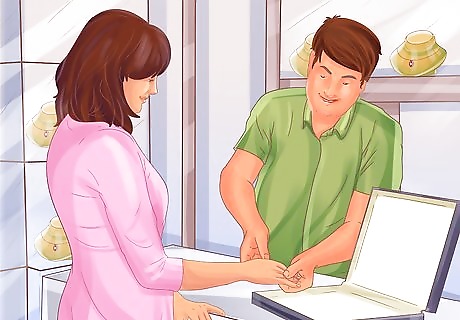 Ask about warranty options. Talk with your jeweler about the wedding band's warranty, and ask them questions about their specific policy. Does your jeweler offer free ring cleanings? What about resizing, and how long do they offer this after the ring is purchased? What if a gemstone falls out of the band, or you lose your ring? To what extent will the jeweler replace your ring? Check their jewelry return policies in case you need to use them. Some jewelers offer ring insurance in case your wedding band gets lost or stolen.