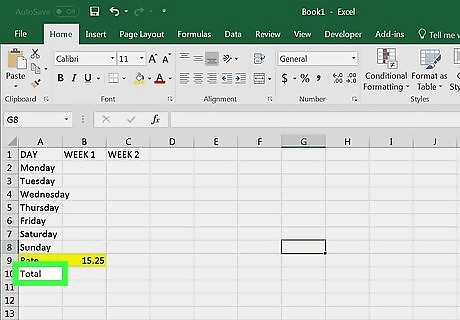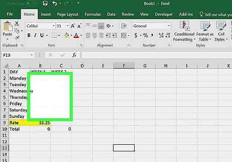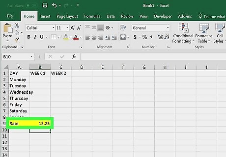 Add a rate. Type Rate into cell A9, then enter the rate per hour in cell B9. For example, if the rate is $15.25 per hour, you'll type 15.25 into cell B9.