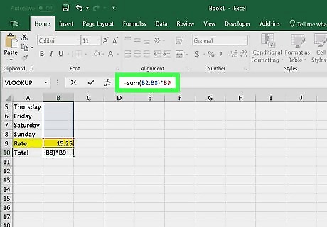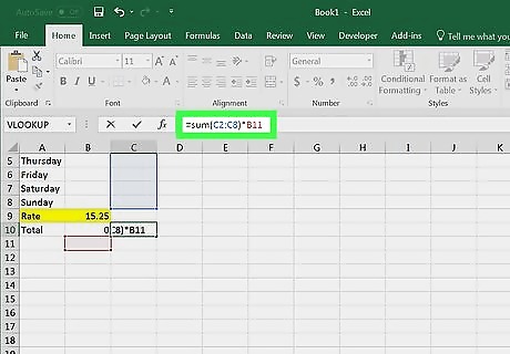 Enter the formula for Week 1. This formula will add up the hours worked from Sunday through Saturday and then multiply the sum by the rate. To do this: Click the Week 1 "Total" cell, which should be B10. Type in =sum(B2:B8)*B9 and press ↵ Enter.