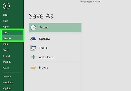 Save your time sheet. To do so: Windows - Click File, click Save As, double-click This PC, click a save location on the left side of the window, type the document's name (e.g., "January Time Sheet") into the "File name" text box, and click Save. Mac - Click File, click Save As..., enter the document's name (e.g., "January Time Sheet") in the "Save As" field, select a save location by clicking the "Where" box and clicking a folder, and click Save.