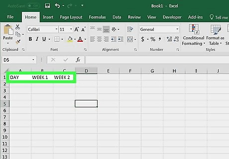 Enter your headers. Type the following headers into the following cells: A1 - Type in Day B1 - Type in Week 1 C1 - Type in Week 2 You'll add Week [number] in the D1, E1, and F1 (if necessary) cells as well. If you observe overtime, you can add an Overtime heading in cell C1 for Week 1, cell E1 for Week 2, and so on.
