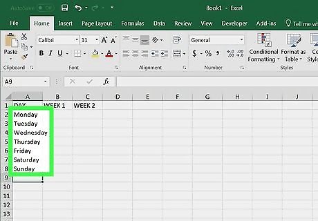 Enter your days of the week. In cells A2 through A8, type in Sunday through Saturday in order.