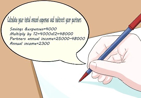Add up your total annual expenses and subtract your partners (or any other income). Add up your monthly debt expenses, monthly savings, and total monthly family expenses. Then, subtract your partner's income or any other income that comes in from sources other than you. This is an important step, because it determines how much of the total family expenses would need to be covered if you were not there. For example assume your monthly debt, savings, and expenses are $4,000. Multiply this by 12 to get the annual amount. Your total family expenses would therefore be $48,000 annually. Assume your partner makes $25,000 annually. Subtracting $25,000 from $48,000 gives total remaining expenses of $23,000. You would therefore need enough money to provide $23,000 annually.