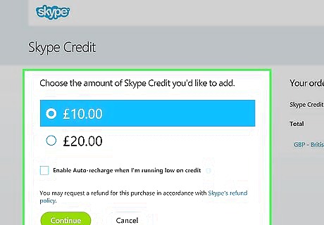 Add credit to Skype if necessary. Skype is only a free service if you’re calling another Skype account. To call a phone number, go to your account and select “Buy Credit.” Select an amount, add your payment information, and then press “Pay Now.” You will be able to make calls until the credit runs out. Chats, such as FaceTime, are always free, though both parties must own Apple products to use it.