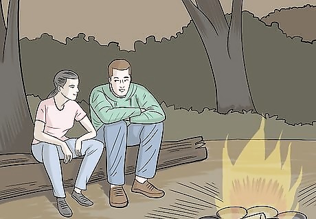 Build a campfire underneath tree cover if possible. Light tree cover helps protect your fire from wind and rain if the weather starts getting worse. Set up your logs inside the fire pit either in a cone or box shape to help maintain a consistent burn. Fill in any gaps with smaller pieces of wood or paper to use as kindling to make starting the fire easier. Light the kindling underneath the logs to start the fire and let it burn. Only use a few logs at a time so your fire doesn’t get out of control while it’s burning. Make sure you start your fire inside of a pit so it doesn’t spread. Put out your fire completely when you’re finished using it so it doesn’t keep burning while it’s unattended.