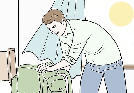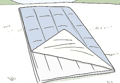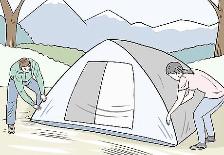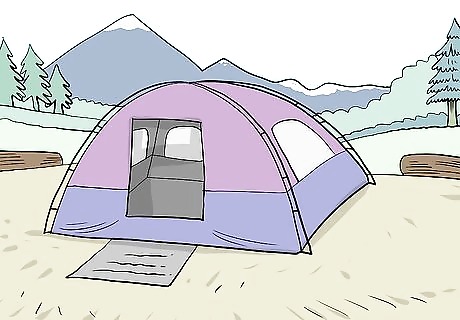 Place your tent on flat, dry ground. Once you arrive at your campsite, look for a level place that doesn’t have large rocks or tree roots to set up your tent. Make sure there aren’t any broken or dead tree limbs above the area since they could fall on your tent in severe weather. Clear the ground as much as you can from any sticks or small rocks so you don’t feel them while you’re sleeping. When you pitch your tent, make sure it’s stretched out completely so it’s open to its full size. If you can’t find any level ground for your tent, make sure you sleep with your head elevated or else you can get headaches or feel uncomfortable. Make sure to always keep your tent zipped so bugs or animals can’t get inside.