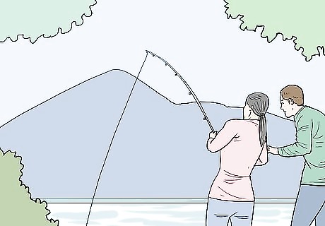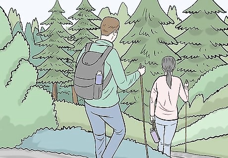 Go hiking if you want to explore the area where you’re staying. Check if there are any trails nearby that you can hike along so you can surround yourself with nature. Make sure the trails aren’t too long before you leave, or else you may get too exhausted before you can finish them. When you go out for your hike, put on hiking boots so you can get around easily without hurting yourself. Take snacks and water along with you so you don’t get exhausted or dehydrated while you’re out. If you plan on going hiking off of a known trail, then make sure you have a map and a compass so you don’t get lost. Don’t litter or leave anything behind on the trails since it could affect local wildlife.