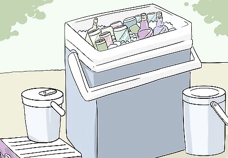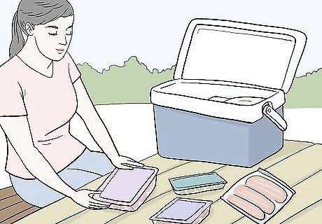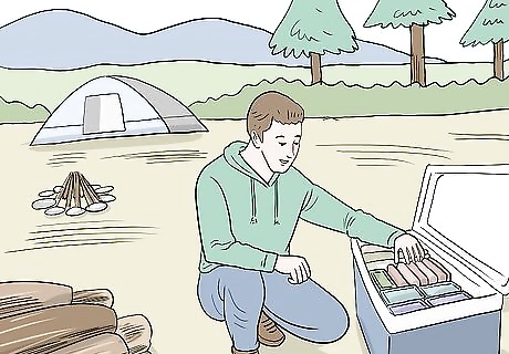 Use a cooler to help keep food and drinks cold. Pack an insulated cooler with ice and place any food or drinks you want to keep cold while you’re camping. Bring enough water to last through your entire trip so you don’t get dehydrated and so you can stay cool. Store foods in plastic containers and stack them in your cooler so you can use the space efficiently. Some campgrounds have ice on site so you can refill the cooler when the old ice melts.
