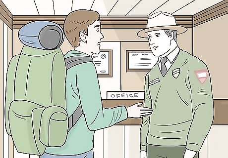Check in with a park ranger or campground office if you need to. Once you arrive at the campground, check in with a park ranger or at the camp offices to confirm your campsite. Let them know you arrived and tell them if you made a reservation before you came. Ask about any special rules or restrictions they have on the grounds so you know what you’re allowed to do. Once they check you in, they will help direct you to your campsite so you can start setting up. Look at the office or ranger hours listed when you check in so you know when you’re able to contact them or get supplies if you need them.